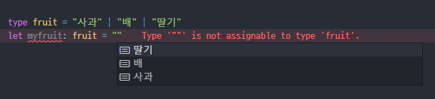 이렇게 fruit이라는 타입을 만들어 놓고 변수를 만들어 타입을 fruit으로 지정하게 되면 3가지 밖에 쓰지 못한다.