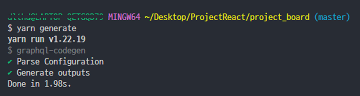 이제 yarn generate 명령어를 사용할 수 있는데, 처음에 yarn add -D @graphql-codegen/cli 를 설치했기 때문에 사용이 가능해진 것이다.