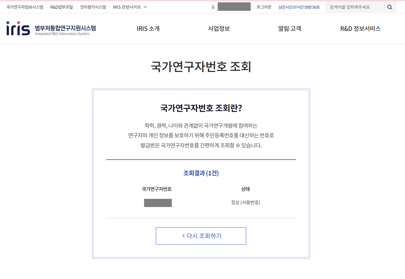 국가 연구자 번호찾기를 누르면 다음과 같이 발급받은 번호를 확인할 수 있다!