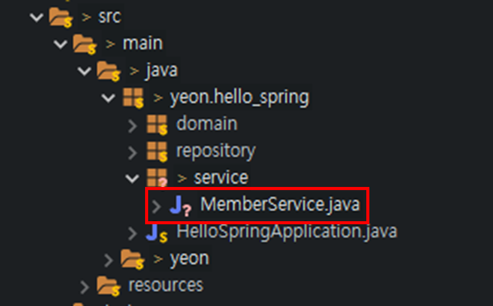 src / main / java / yeon.hello_spring 에서 service 패키지를 만들고