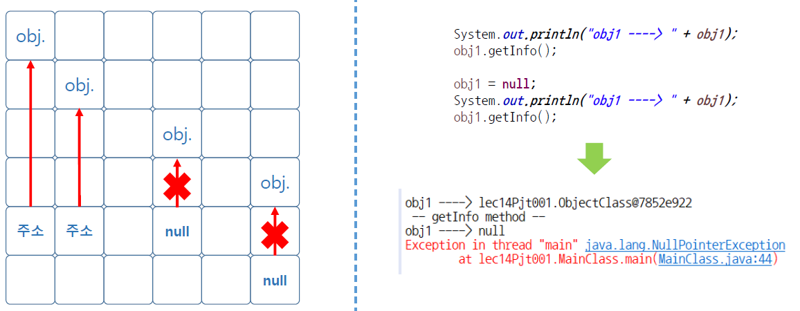 obj1 에 null 값을 넣게되면 레퍼런스와 객체의 연결이 끊기며 sysout으로 출력했을 때 null이 나온다.
