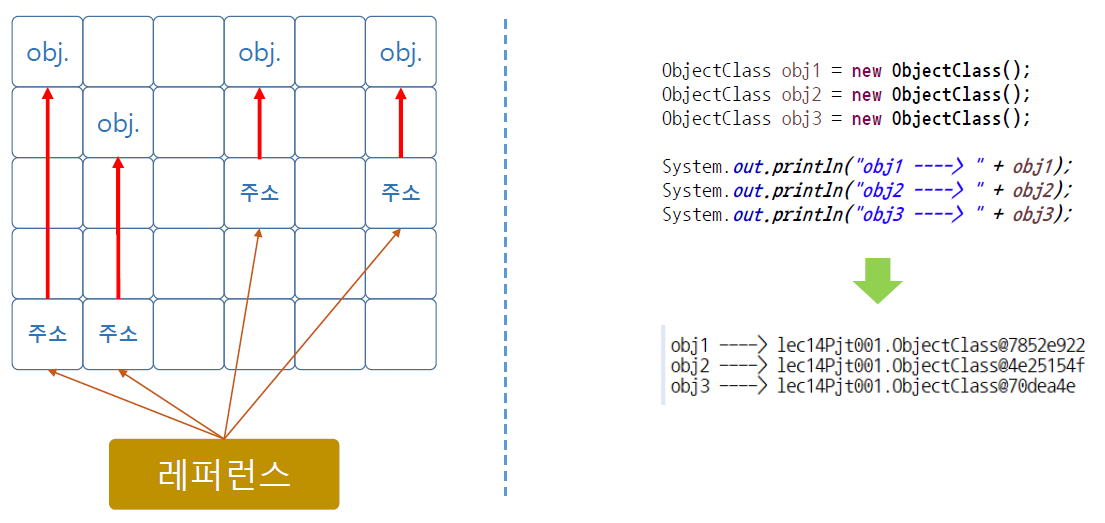 즉, 3개의 레퍼런스(obj1, obj2, obj3)가 가리키는 메모리의 주소가 다르다는 뜻이다.