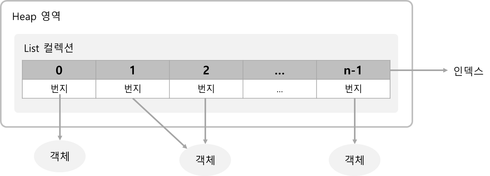 List 컬렉션은 객체 자체를 저장하는 것이 아니라 객체의 번지를 참조한다. 그렇기 때문에 동일한 객체를 중복 저장할 수 있는데, 이 경우 동일한 번지가 참조된다. null도 저장이 가능하며, 이 경우 해당 인덱스는 객체를 참조하지 않는다.